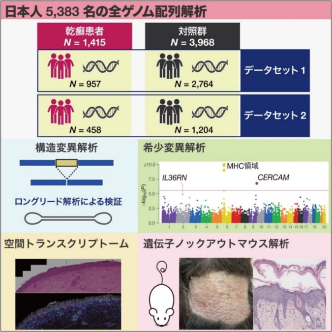 東京大学大学院医学系研究科遺伝情報学の曽根原究人助教(研究当時、現:ウェルカム・サンガー研究所Postdoctoral Fellow)、岡田随象教授(兼:大阪大学大学院医学系研究科 遺伝統計学 教授、理化学研究所生命医科学研究センター チームディレクター)、東京大学医科学研究所 附属ヒトゲノム解析センター シークエンス技術開発分野の松田浩一特任教授(兼:同大学大学院新領域創成科学研究科 メディカル情報生命専攻クリニカルシークエンス分野 教授)、東京科学大学大学院医歯学総合研究科免疫学分野の佐藤荘教授、名古屋市立大学大学院医学研究科加齢・環境皮膚科学分野の森田明理教授らによる研究グループは、日本人乾癬患者と対照者の計5,383名の全ゲノムシークエンス解析により、これまで未解明だった希少変異(注1)および構造変異(注2)の疾患への関与を網羅的に解析しました。構造変異の解析では、IFNLR1遺伝子座の3.3kb欠失が乾癬発症リスクを有意に低下させることを発見しました。希少変異の解析では、CERCAM遺伝子を新たな乾癬関連遺伝子として発見しました。Cercam遺伝子欠損マウスを用いた実験では、乾癬モデルで皮膚炎症の増悪が観察されました。本成果は、従来のゲノムワイド関連解析(GWAS、注3)では見逃されてきた希少変異と構造変異が乾癬の発症に関与することを示すものであり、疾患の分子メカニズム理解や新規治療標的探索につながると期待されます。