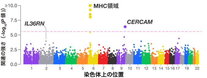 各点は遺伝子の染色体上での位置(x軸)と関連の強さ(y軸)を示す。ピンクの破線はゲノムワイド有意水準を示す。
