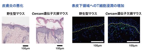 さらに、in vivo機能検証として、Cercam欠損マウスにイミキモド誘発乾癬モデル(注12)を適用したところ、野生型マウスに比べて皮膚炎症が悪化し、乾癬関連サイトカイン(注13)の発現上昇や表皮下領域へのT細胞浸潤増加が観察されました(図3)。