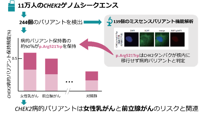 理化学研究所(理研)生命医科学研究センター基盤技術開発研究チームの竹原侑里大学院生リサーチ・アソシエイト、碓井喜明基礎科学特別研究員、桃沢幸秀チームディレクター(生命医科学研究センター副センター長)、東京大学医科学研究所附属ヒトゲノム解析センターシークエンス技術開発分野の松田浩一特任教授(同大学大学院新領域創成科学研究科メディカル情報生命専攻クリニカルシークエンス分野教授)、日本医科大学先端医学研究所分子生物学部門の村上善則特命教授、国立がん研究センター研究所ゲノム生物学研究分野の河野隆志分野長、同中央病院遺伝子診療部門の平田真部門長(研究当時:東京大学医科学研究所癌・細胞増殖部門人癌病因遺伝子分野非常勤講師)、佐々木研究所附属杏雲堂病院遺伝子診療科の菅野康吉科長らの国際共同研究グループは、がん関連遺伝子であるCHEK2の病的バリアント[1]が乳がん、前立腺がんの発症リスクを上昇させることに加え、病的バリアントを持つ人におけるそれぞれのがんの特徴を明らかにしました。本研究成果は、CHEK2とがんの関連を、共同研究者であるプラハ・カレル大学のズデニェク・クレイブル教授らによる機能解析[2]結果も用いて初めて大規模に評価したものであり、遺伝診療の指針作りにつながることが期待されます。