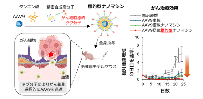 東京科学大学(Science Tokyo)総合研究院 化学生命科学研究所の松平望(当時、大学院博士課程学生)、本田雄士助教(川崎市産業振興財団ナノ医療イノベーションセンター<iCONM>主任研究員兼任)、西山伸宏教授(同主幹研究員兼任)らのグループ、iCONM喜納宏昭博士(同主幹研究員)らのグループ、東京大学医科学研究所附属遺伝子・細胞治療センター 分子遺伝医学分野の喜納(早下)裕美特任助教、岡田尚巳教授らのグループが共同で、脳腫瘍にピンポイントでアデノ随伴ウイルスベクター(AAV)※1を送達する標的型ナノマシン※2を開発しました。この標的型ナノマシンは、がん細胞特異的に結合するタグ(荷札)分子、ワインなどの渋み成分であるタンニン酸※3、そして精密合成高分子から構成されています。これにより、生体内での中和抗体や免疫反応からAAVを保護しつつがん細胞まで選択的に送達し、AAV 自体の高い活性を維持したまま、がん細胞内でのみAAVを放出することが可能となります。AAVは、遺伝子治療用ベクターとして臨床応用され近年期待が高まっていますが、がん治療においては、患部への不十分な集積と高用量投与による深刻な肝毒性が課題となります。今回、新たに開発した標的型ナノマシンを用いて、AAVを脳腫瘍へ選択的に届けることに脳腫瘍モデルマウスで成功し、従来の3分の1の投与量で高い安全性と有効性を実証することができました。