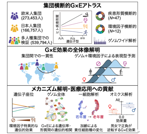〈研究の背景〉GWASをはじめとして、ヒトゲノム研究はヒト疾患形質の病態解明に大きく貢献してきました。しかし、これらの研究は遺伝的効果を不変の値として扱うことで、生物の持つ本質的な複雑性を単純化して捉えていました。実際には、ヒトの表現型は性別・加齢・生活習慣といった環境因子によって大きく変動します。この変動は、ゲノム研究においては「環境因子による遺伝的効果の変動(G×E効果)」として捉えられます。G×E効果は環境因子特有の遺伝的効果の同定や、ゲノム・環境因子の両方に基づいた精緻な疾患リスク予測に貢献すると期待されています。しかし、これまでヒトにおいて確立されたG×E効果はごく少数でした。G×E効果を大規模に調べた研究は一部の形質や環境因子、一部のゲノム領域に限られており、主に欧米人集団において実施されていたためです。そのため、様々な疾患形質・環境因子・集団におけるG×E効果の全体像は未解明でした。