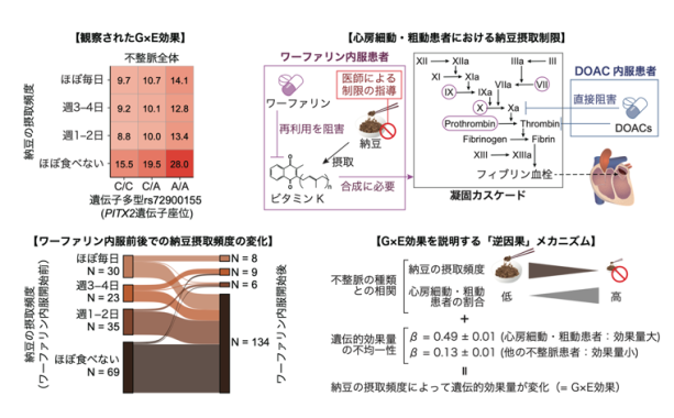 (左上):PITX2遺伝子座位において観察された、不整脈に対する納豆のG×E効果。数字は不整脈患者の割合(%)を表す。(右上):抗凝固薬の作用機序および、ワーファリン内服患者に推奨される納豆摂取制限。心臓のイラストの出典:TogoTV (2016 DBCLS TogoTV, CC-BY-4.0)。(左下):ワーファリンを内服する心房細動・心房粗動患者のうち、ワーファリン内服開始 前後での納豆摂取頻度情報が利用可能であった157人についての、納豆摂取頻度の変化。(右下):納豆のG×E効果を説明する「逆因果」メカニズムの概要。