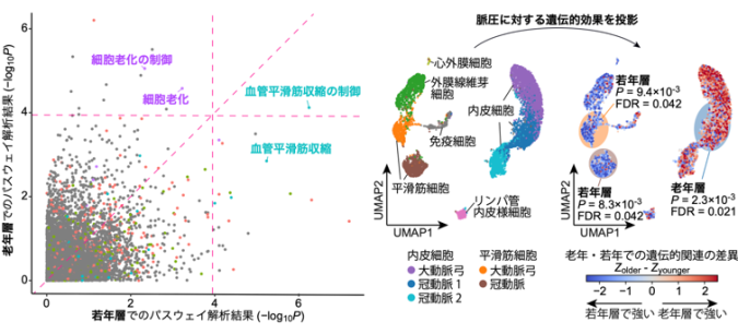 (左):若年・老年で層別化して実施した脈圧のGWASに対するパスウェイ・エンリッチメント解析。(右)サル大動脈の一細胞RNAシークエンスデータに対する脈圧の年齢層別化GWAS結果の一細胞投影解析。