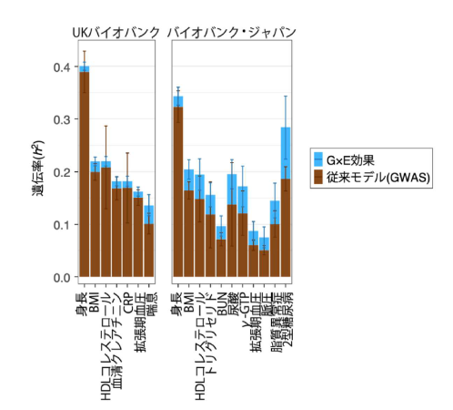 また、G×E効果がゲノム全体としてどれだけの効果を合計で有しているか(形質の個人差のうち遺伝的に説明可能な割合;遺伝率)を調べたところ、UKバイオバンクでは7形質、バイオバンク・ジャパンでは11形質に対して有意に遺伝率が検出されました(図4)。特に、身長・BMI・HDLコレステロール・拡張期血圧の4形質は両バイオバンクで共通しており、疾患形質全体でみても、G×E効果の持つ遺伝率は有意に相関していました。以上のことから、G×E効果は集団間である程度共通していると考えられます。