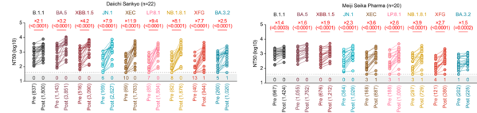 本研究では2種類のオミクロンXEC株対応一価ワクチン(第一三共社製mRNAワクチン、Meiji Seikaファルマ社製レプリコンワクチン)について、ワクチン接種前および接種3-4週間後の血清による中和抗体誘導効果を検証しました。これらの血清を用いて、これまでのワクチン株およびオミクロンJN.1子孫株、およびその組換え変異株、オミクロンBA.3.2株に対する感染中和活性を検証したところ、第一三共社のオミクロンXEC株対応一価ワクチンでは血清の中和活性が接種前(Pre)に比べ接種後(Post)は2.1-11.9倍(図1左)に、Meiji Seikaファルマ社のオミクロンXEC株対応一価ワクチンでは血清の中和活性は、Preに比べて、Postは1.4-3.9倍(図1右)に有意差を持って上昇しました。いずれのオミクロンXEC株対応一価ワクチン後血清においても、オミクロンJN.1株およびその子孫株や組換え変異株、オミクロンBA.3.2株に対しても中和活性が認められたことから、これらのXEC株対応一価ワクチンは現在の流行株を含む、これらの免疫逃避能の高い変異株に対する感染予防効果、重症化予防効果が期待されます。