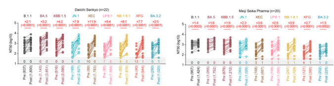 オミクロンXEC株対応一価ワクチン(mRNAワクチン:第一三共社製、左図;レプリコンワクチン:Meiji Seikaファルマ社製、右図)の接種前(Pre)と接種後(Post)の血清の中和活性を評価した。縦軸はウイルス感染を50%阻害する中和抗体価(NT50値)を示し、値が大きいほど中和活性が高いことを示す。横軸括弧内の数字はそれぞれの変異株に対するNT50値の中央値を示し、上下の波線はそれぞれ中和抗体価の検出上限(29,160倍)および下限(40倍)を示している。検出下限下部のグレー領域は検出限界以下の範囲を示している。横軸上の数字は中和抗体価が検出下限以下の血清数を示している。また、図中にはワクチン接種前後のNT50値の上昇倍率を、ウィルコクソンの符号順位検定結果とともに赤字で示している。