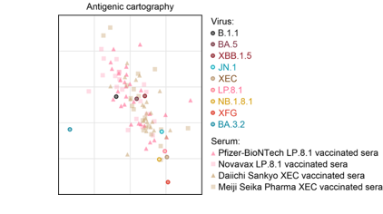 オミクロンLP.8.1株対応一価ワクチン(mRNAワクチン:ファイザー/ビオンテック社製、および、組換えタンパク質ワクチン:ノババックス/武田薬品工業社製)とオミクロンXEC株対応一価ワクチン(mRNAワクチン:第一三共社製、および、レプリコンワクチン:Meiji Seikaファルマ社製)を接種した人の接種後の血清の中和活性データを用いて液性免疫の交差性を比較した。図中の丸印はウイルス抗原、三角印もしくは四角印は血清を示す。