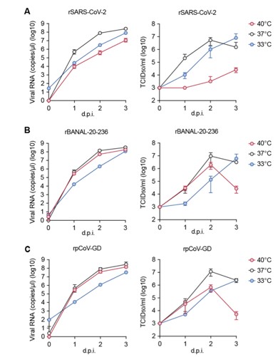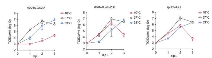 SARS-CoV-2を含む新興ウイルスにおける宿主適応機構の解明は、将来のパンデミックへの備えの観点から極めて重要です。近年、SARS-CoV-2の温度感受性がヒト宿主におけるウイルス適応度(注5)に影響を及ぼす可能性が示唆されており、後期に出現した変異株は、上気道環境に特徴的な低温条件下での複製に適応しつつあることが報告されています。近年の分子疫学的調査の進展に伴い、サルベコウイルスに関する研究は大きく進展してきました。その結果、コウモリやセンザンコウなどの野生動物を主な自然宿主として、多様なサルベコウイルスが次々と同定、分離され、その遺伝的多様性や進化的特徴に関する知見が蓄積されつつあります。しかしながら、野生動物に由来する他のサルベコウイルスにおける温度感受性については、これまで十分に解明されていませんでした。本研究では、コウモリおよびセンザンコウ由来サルベコウイルスの耐熱性を評価することを目的として、SARS-CoV-2祖先株(WK-521)、コウモリ由来サルベコウイルス(BANAL-20-236)、ならびにセンザンコウ由来サルベコウイルス(pCoV-GD)の計3種のウイルスを用いました。これらのウイルスをVeroE6/TMPRSS2細胞(注6)に感染させ、33℃、37℃、および40℃の各温度条件下で培養しました。感染後1~3日目に培養上清を回収し、RT-qPCR(注7)により細胞外ウイルスRNA量を、またTCID50法(注8)により感染性ウイルス価をそれぞれ測定し、感染動態の比較解析を行いました(図)。