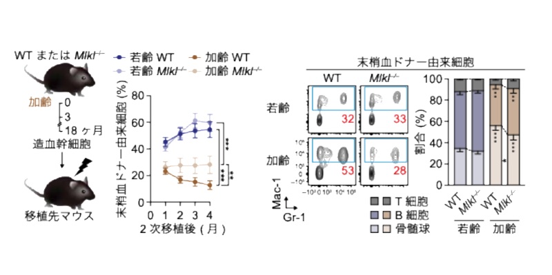 以上の結果を受け、実際に加齢したマウス造血幹細胞におけるMLKLの関与を検証しました。18ヶ月齢まで加齢させた野生型およびMLKL欠損マウスの造血を比較したところ、加齢個体で認められるリンパ球産生の低下はMLKL欠損により有意に緩和され、老化の指標でDNA損傷マーカーとしても知られるγH2AXの蓄積も加齢MLKL欠損マウスより採取した造血幹細胞では有意に軽減していました。加えて、加齢個体から採取した造血幹細胞を用いて別個体に移植したところ、老化した造血幹細胞の特徴である自己複製能およびリンパ球系分化能の低下は、部分的ではあるもののMLKL欠損により有意に改善しました(図2)。以上の結果から、MLKLは加齢に伴う造血幹細胞の機能低下の少なくとも一部を媒介することが示されました。