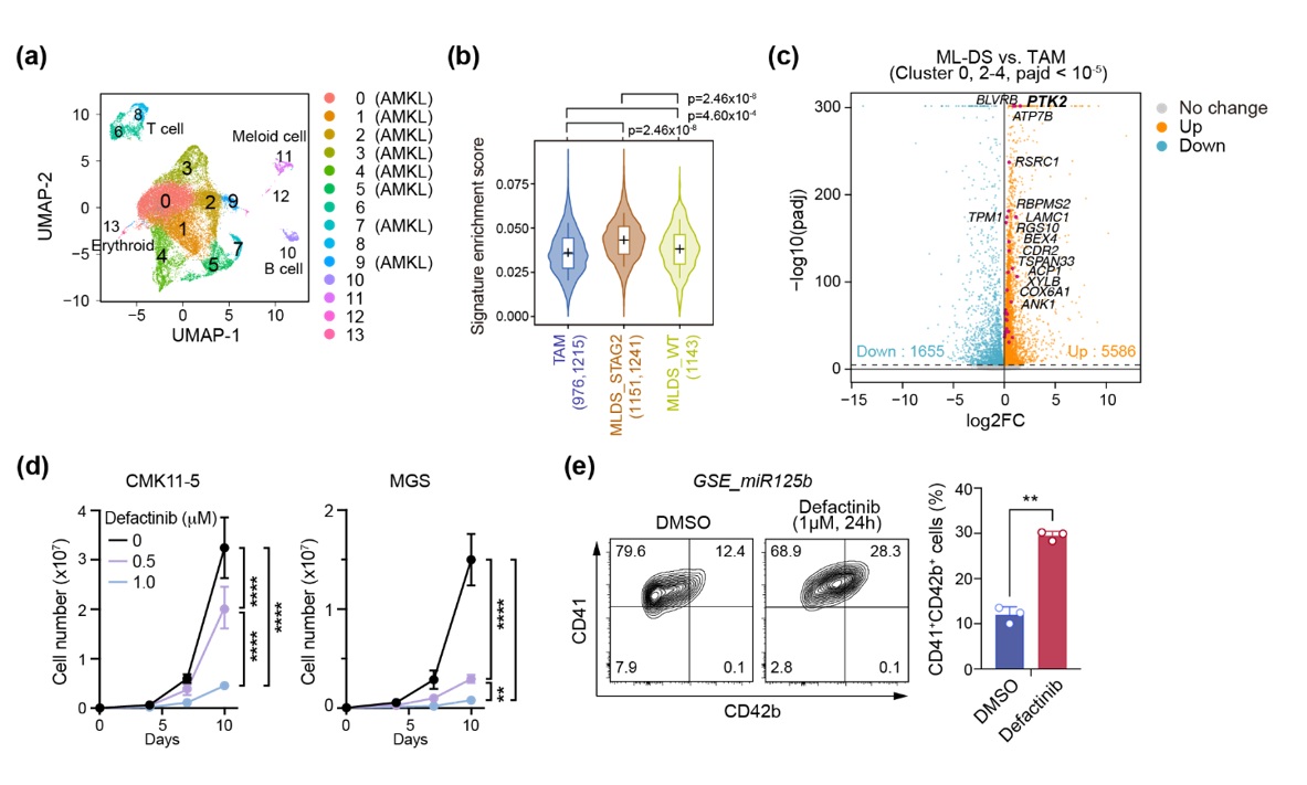 (a)ML-DS患者検体を用いたシングルセルRNAシークエンスのUMAP。クラスター0-5, 7, 9にAMKL細胞が分布する。(b)TAMと比較してSTAG2変異を有するML-DSにおいてPRC2複合体標的遺伝子の発現が上昇。(c)ML-DSとTAMにおける遺伝子の発現の違いを示すvolcano plot。ML-DSでPTK2の発現が有意に上昇する。(d)PTK2阻害剤であるデファクチニブは、2種類のヒトML-DS細胞株CMK11-5およびMGSの増殖を抑制する。(e)また、デファクチニブはGata1s/Stag2/Ezh2変異マウス胎仔肝の造血幹・前駆細胞にmiR-125b遺伝子を導入して形質転換させたML-DS細胞(GSE-miR125b細胞)の分化を促進し、巨核球分化マーカー(CD41、CD42b)を上昇させる。