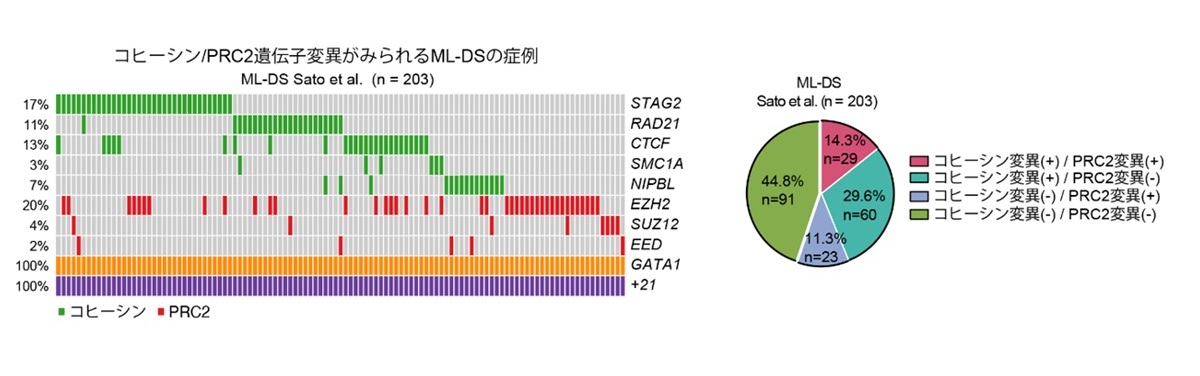 白血病は骨髄中の造血幹・前駆細胞に生じた遺伝子異常により、血液細胞が腫瘍化して増殖する血液のがんですが、ML-DSではエピジェネティックな変化(注4)を引き起こす遺伝子変異が多いことが知られています。ML-DS症例(203例)を対象に遺伝子変異プロファイルを解析したところ、コヒーシン(注5)遺伝子およびポリコーム複合体2(Polycomb Repressive Complex, PRC2:注6)遺伝子の変異が約半数の症例でみられ、さらに全体の約14%ではこの2種類の変異が重複して存在することがわかりました(図1)。